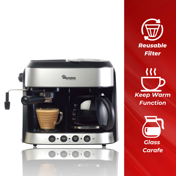 • The Ramtons Cappuccino Maker RM/753 is a stylish espresso and cappuccino machine with a 1.25L water tank and built-in milk frother, designed to deliver café-quality coffee at home.