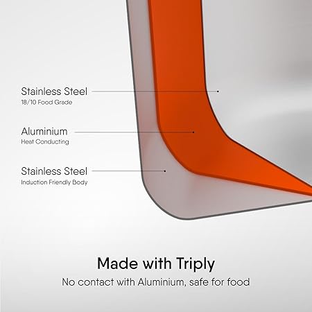 • Triply Construction: Food-grade SS 304, aluminum core, and magnetic stainless steel base for excellent heat conduction and durability, with no aluminum touching food.