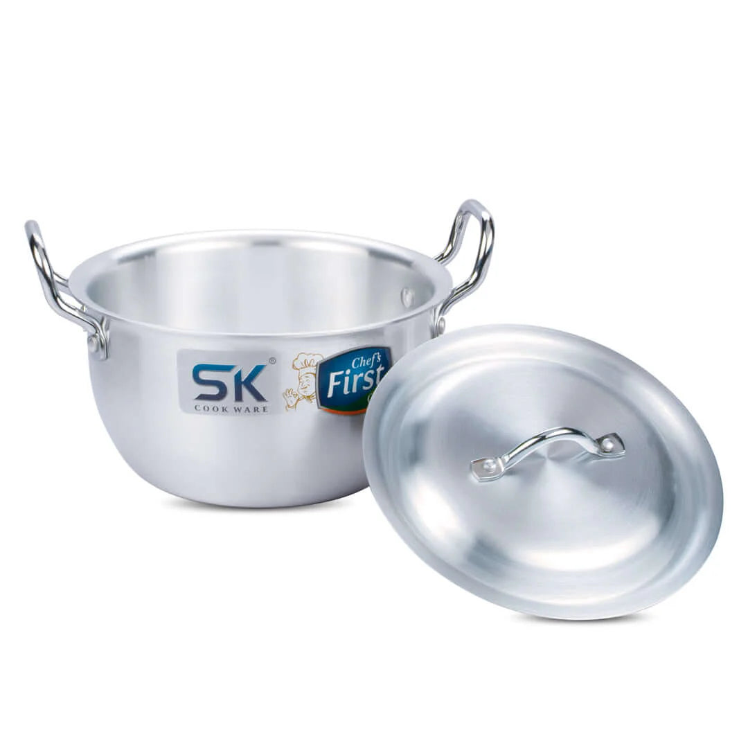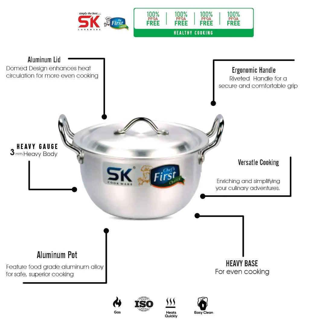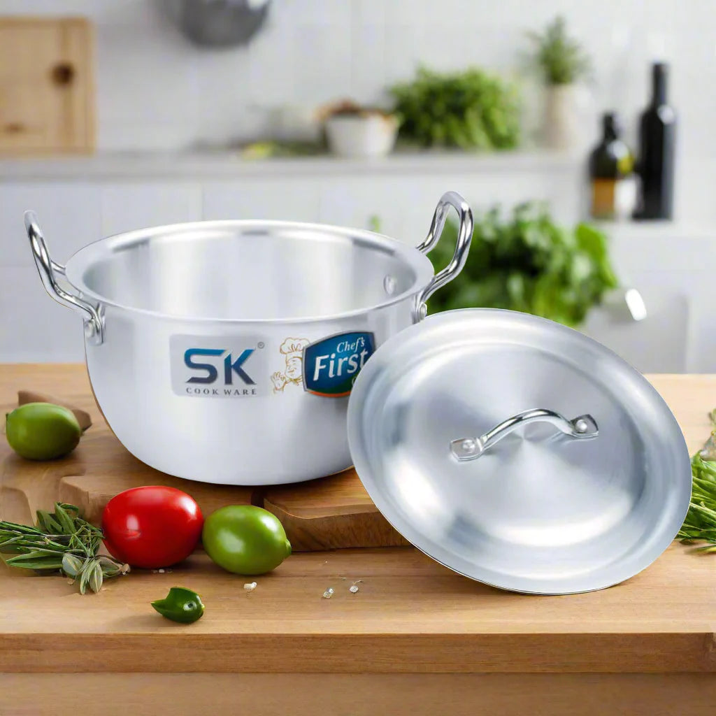 The SK Cookware Tempo 23cm casserole is a heavy-gauge aluminum pot known for efficient and even heat distribution. It has a capacity of either 5 Litres