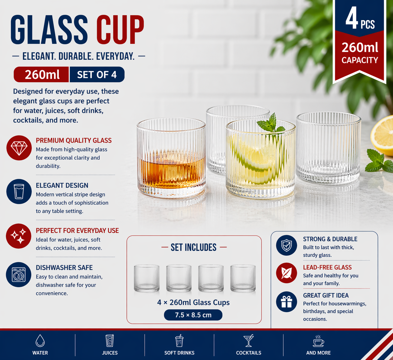 "glass cup 4pcs/color box Unit:Set 7.5*10cm 260ml 254g" "glass cup 4pcs/color box Unit:Set 7.5*10cm 260ml 254g"