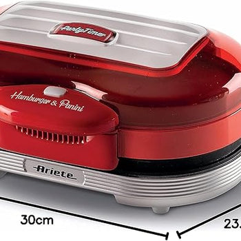 The Ariete 2-Slot Hamburger Maker Retro Party (also known as the Ariete 205 Hamburger Maker Party Time, or model 0205/00 in blue, 0205/01 in red) is a stylish appliance designed to cook hamburgers and warm buns simultaneously...