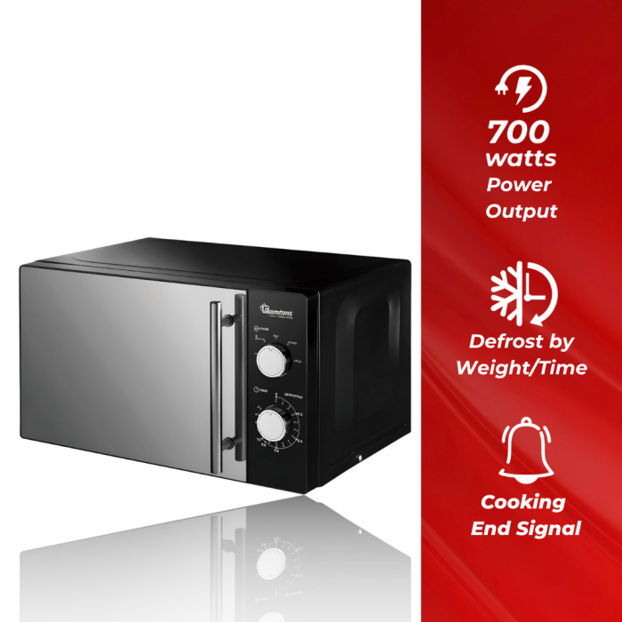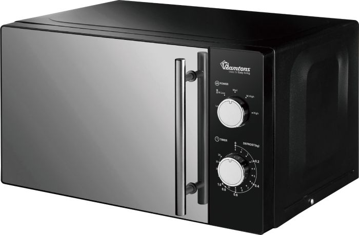 The Ramtons 20Lt Manual Microwave Black Glass (RM/459) is a compact and efficient appliance known for its sleek black exterior with a glass mirror finish and user-friendly manual dial controls. It offers a 20-liter capacity and 700 watts of power for everyday cooking needs.