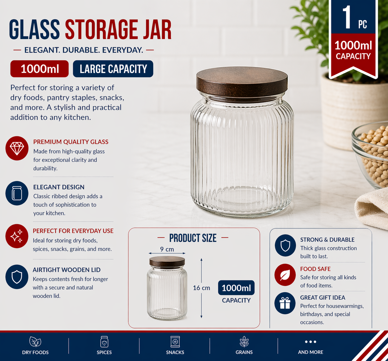 Product Details Capacity: 1000ml (1 Litre) Dimensions: Approximately 8.8 cm diameter x 17.7 cm height Material: Made from non-toxic, high-grade borosilicate glass and an airtight acacia wood or beach wood lid with a silicone seal. Features: The lid...