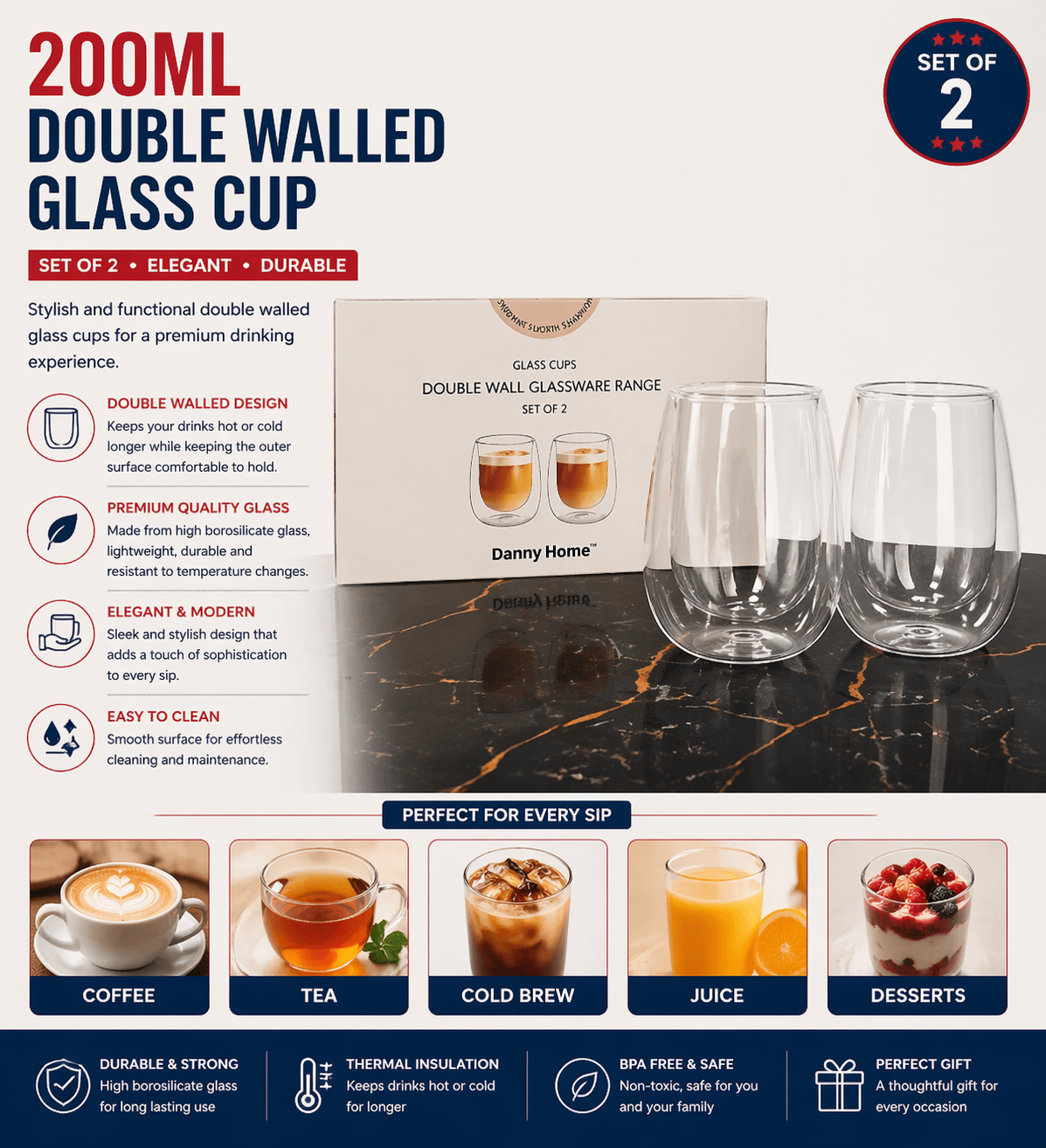 Product Info The double-walled glass is perfect for enjoying latte, cappuccino, tea, smoothies, juice and other hot or cold beverages. The double wall creates an insulating layer that keeps your...