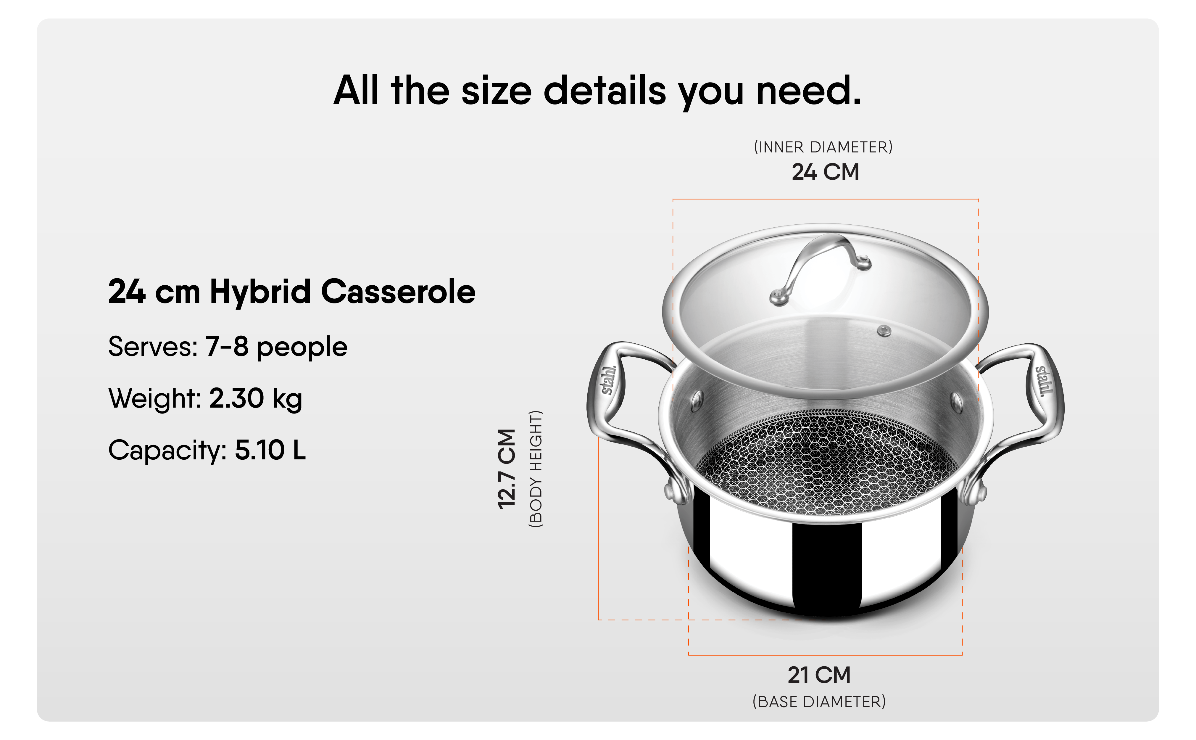 The 5.3L Artisan Hybrid Casserole + Lid 24cm, is premium stainless steel cookware featuring tri-ply construction (stainless steel & aluminum core) for even heating, an innovative honeycomb texture for stick...