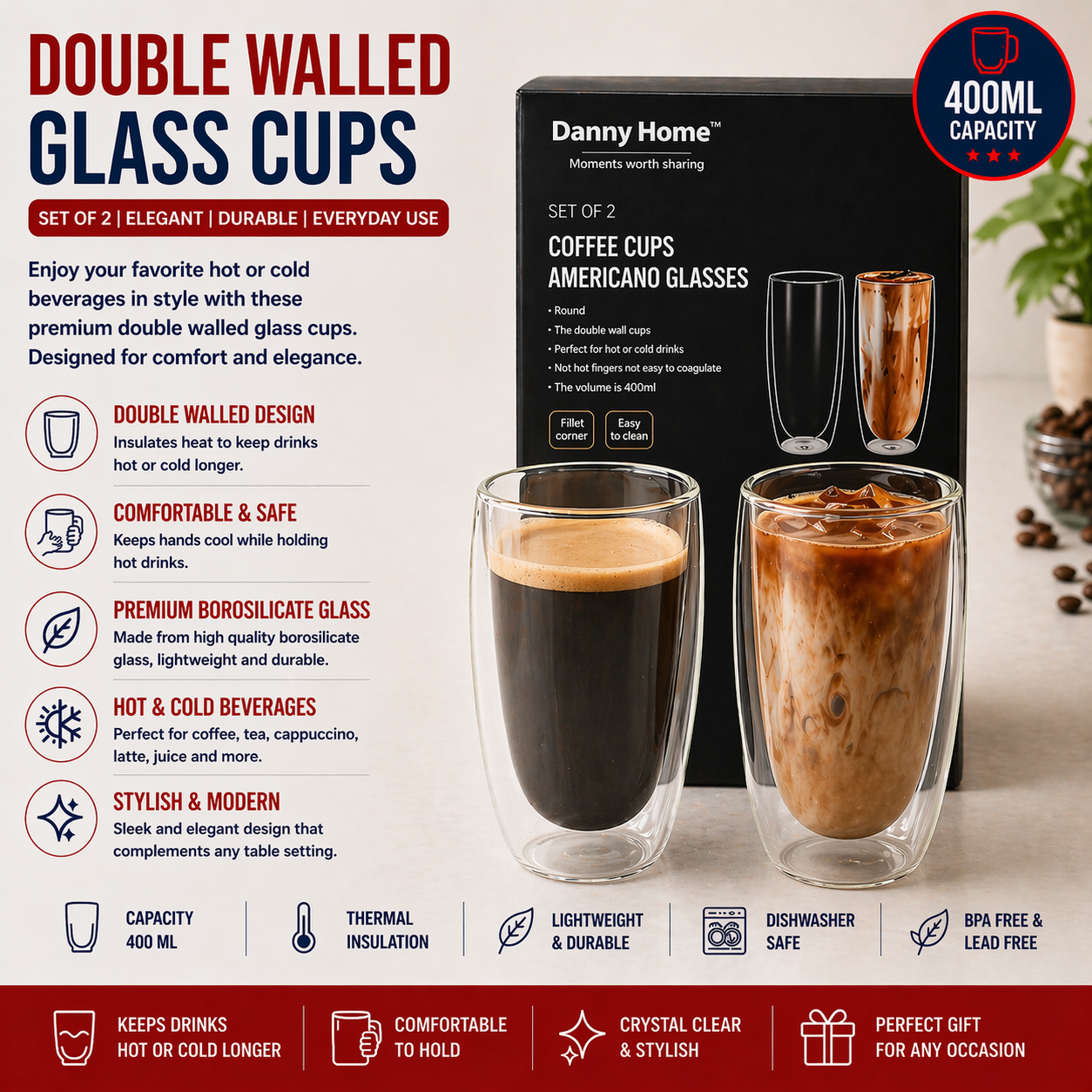 Product Info The double-walled glass is perfect for enjoying latte, cappuccino, tea, smoothies, juice and other hot or cold beverages. The double wall creates an insulating layer that keeps your...