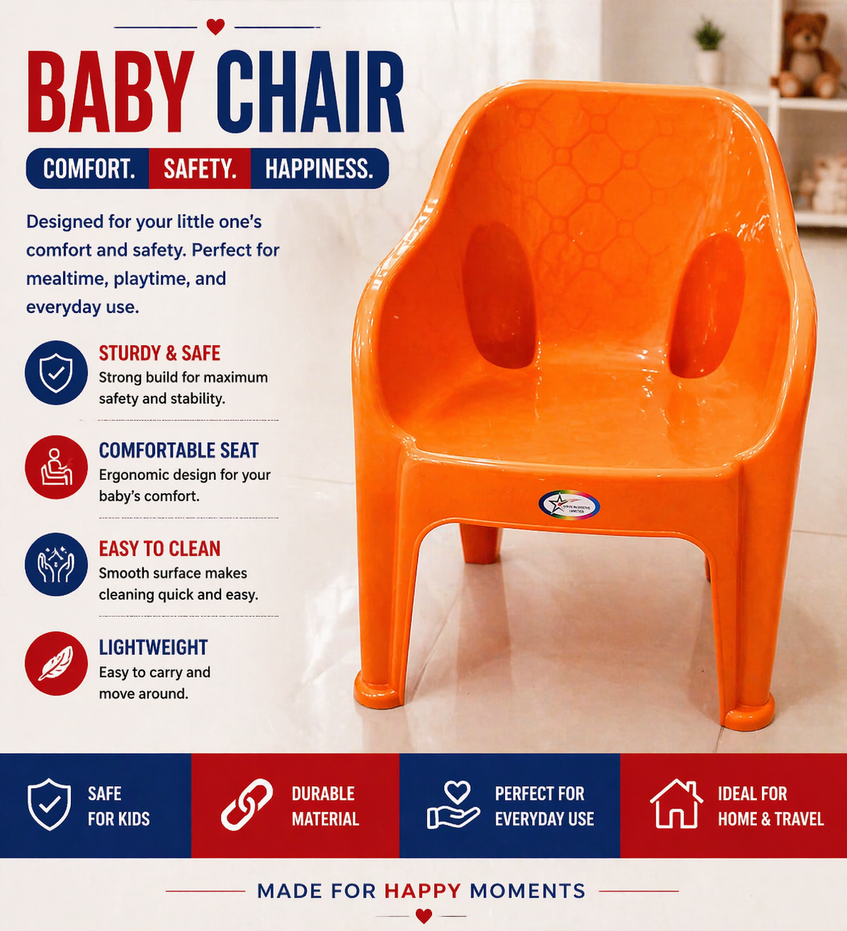 Product DetailsMaterial: High-quality, heavy-duty plastic.Design: Ergonomic high-back with a decorative perforated pattern and integrated armrests for safety and comfort.Usage: Suitable for homes, schools, or outdoor settings like gardens