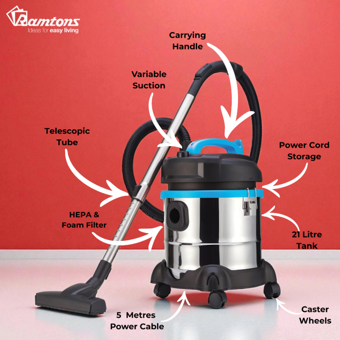 The Ramtons Wet & Dry Vacuum Cleaner (RM/553) is a heavy-duty cleaning appliance featuring a powerful 1400 Watt motor and a 21-liter stainless steel tank, designed to handle both liquid spills and dry...