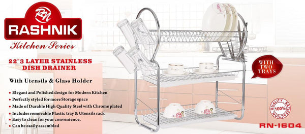 he Rashnik RN-1604 3-Layer Dish Rack is a durable and efficient kitchen accessory designed to streamline dish drying and organization. Key Features: Material: Constructed from high-quality stainless steel, ensuring longevity...