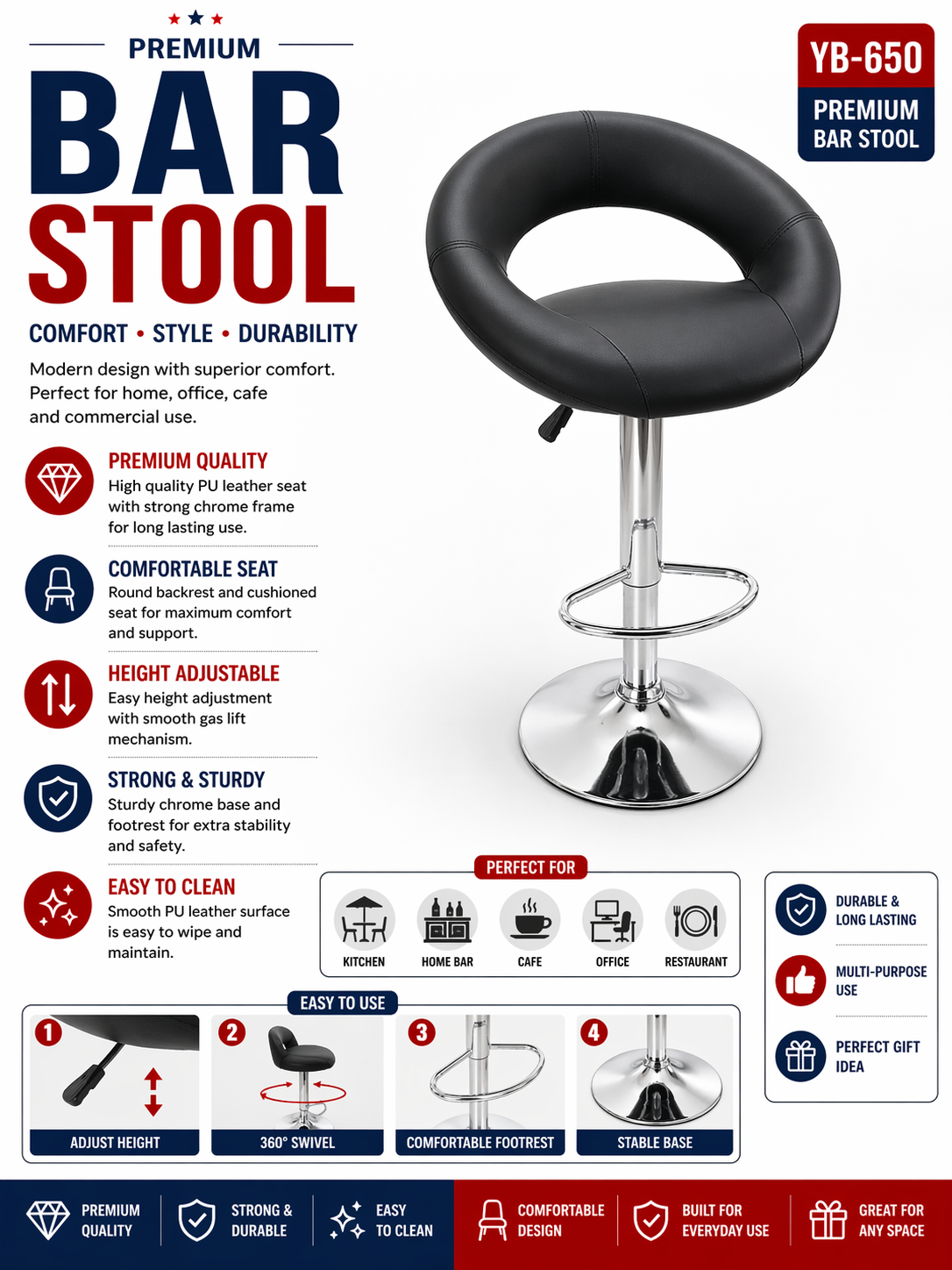 The YB-650 barstool is a modern, height-adjustable swivel barstool featuring a distinct circular or "moon bay" design on the seat and backrest. Key Features Design: The stool has a stylish, contemporary look with a deeply...