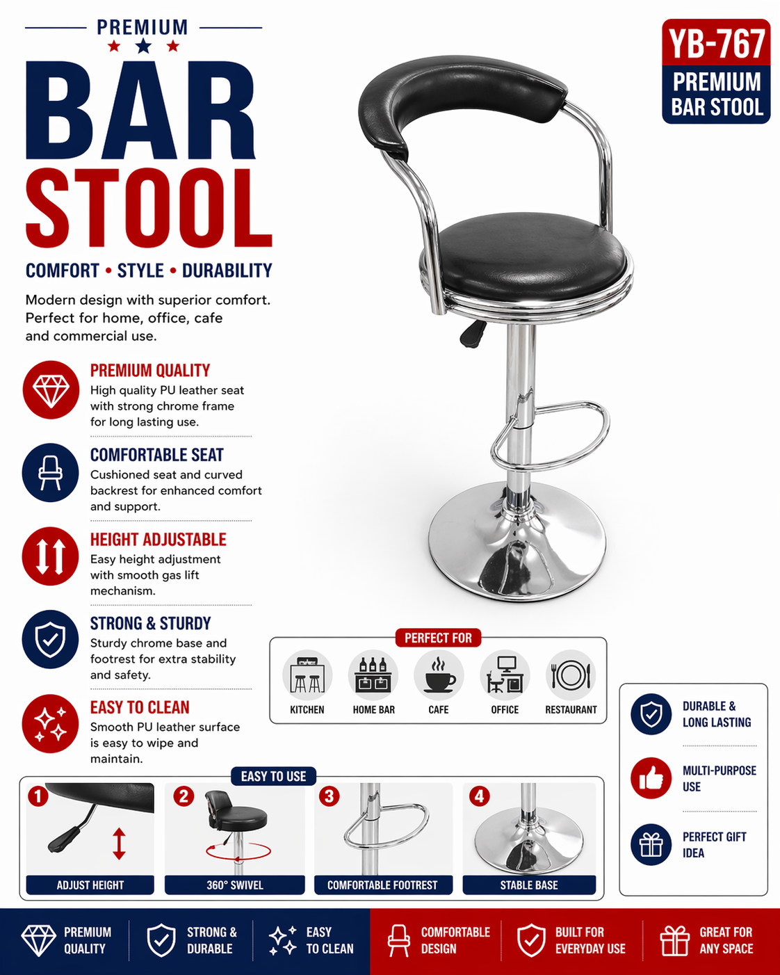 The YB-767 barstool is a modern, height-adjustable swivel barstool featuring a padded black seat and backrest, chrome arms, and a chrome base. It is a widely available, generic model, often sold under various names and...